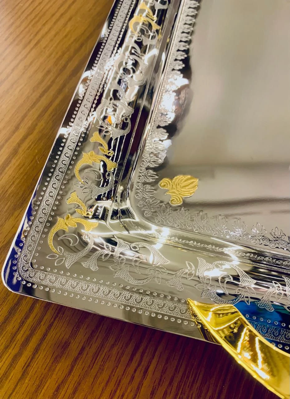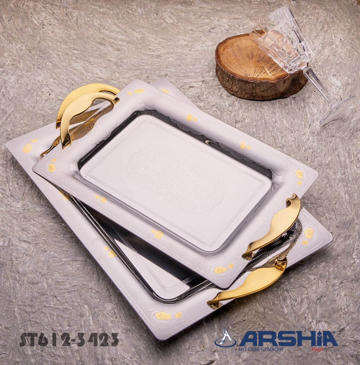صواني تقديمArshiaللمناسبات تجمع بين التصميم الراقي والجودة العالية تضفي جوًا من التميز على أي مناسبة مع التفاصيل الفاخرة الخيار المثالي لإظهار الذوق الراقي. #Arshiaسيفلر في دهبي استالس ااصلي 18علي10مقاوم لللصداء2 قطعه